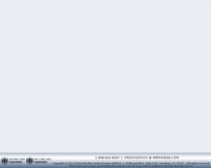 For the past 25 years, Virtual Reality Medical Center (VRMC) has successfully treated patients using Virtual Reality Exposure Therapy (VRET). In most cases, we offer the treatments in combination with cognitive behavioral therapy and biosensors (biofeedback). We specialize in treating phobias, anxiety (including pre-surgical anxiety), stress and pain. Conditions treated include specific phobias such as fear of flying, fear of heights, fear of needles and blood, fear of music performance and public speaking, claustrophobia, fear of spiders, fear of birds, agoraphobia, panic disorder, fear of driving and posttraumatic stress disorder due to motor vehicle accidents. General stress management and relaxation skills are taught for stress-related disorders. At VRMC-Coronado, treatment for Posttraumatic Stress Disorder due to military deployment is offered using VR in combination with biofeedback and individual psychotherapy.